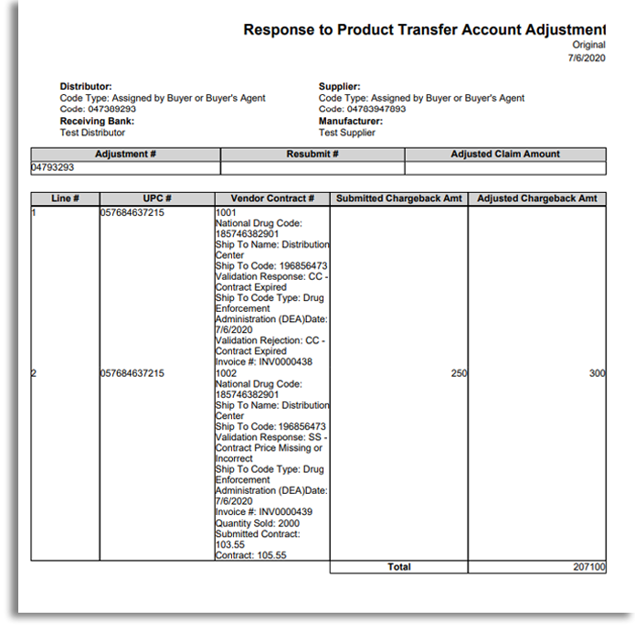 To account for this rebate, after the completion of the sale the wholesaler will send the manufacturer an EDI 844 Product Transfer Account Adjustment, in which they request a credit. The manufacturer then uses EDI 849 as a response document. They can use EDI 849 to indicate whether they are accepting or rejecting an account adjustment outright or need to make changes before accepting.