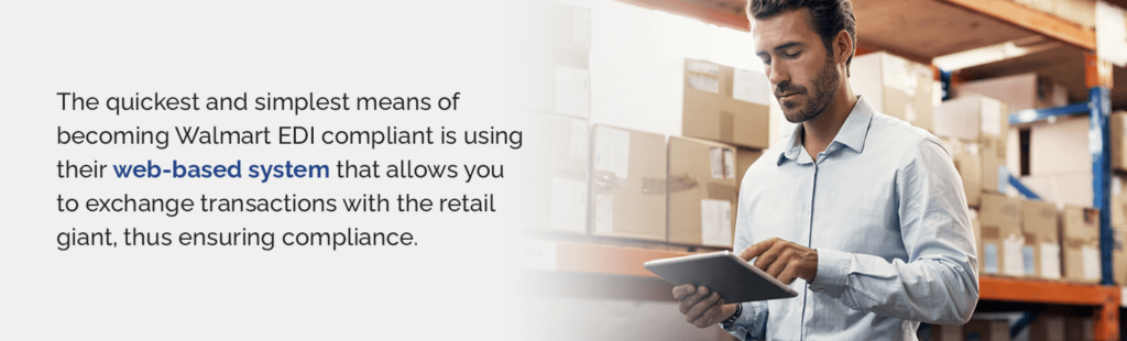 The quickest and simplest means of becoming Walmart EDI compliant is using their web-based system that allows you to exchange transactions with the the company, thus ensuring compliance. Because you are using their system, this is the fastest and most affordable means of becoming Walmart EDI compliant for many businesses.